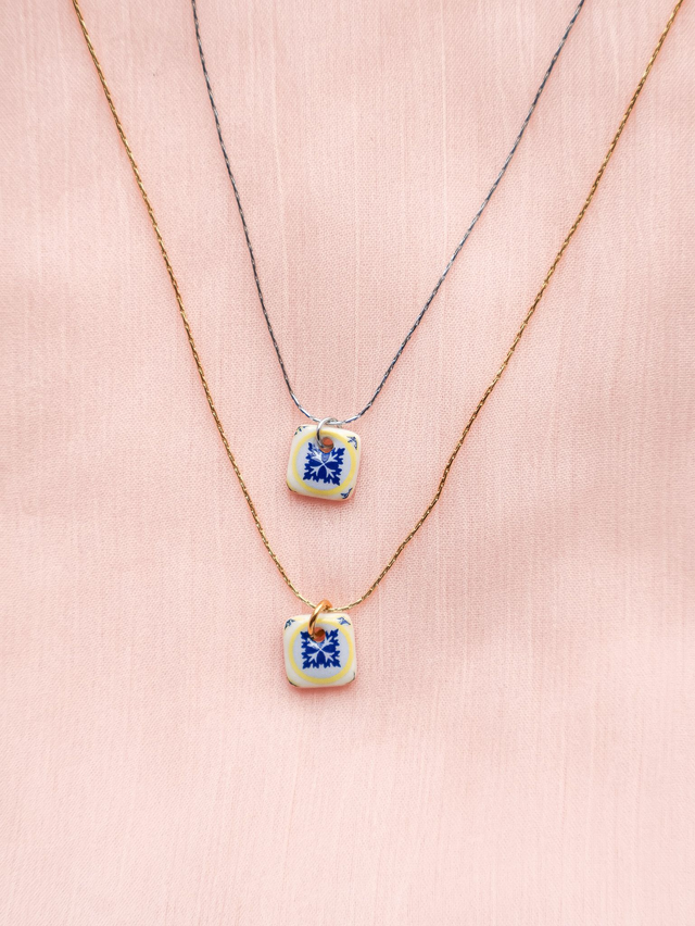 A delicate handmade porcelain square 8mm, stamped with a pattern inspired by Lisbon’s iconic street tiles.