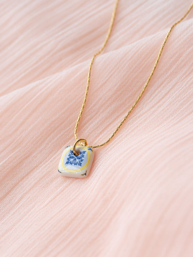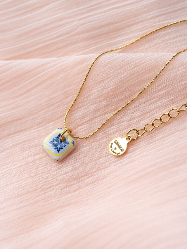 Um delicado quadrado de porcelana feita Ă mĂŁo, com 8mm de detalhe, estampado com um padrĂŁo inspirado nos azulejos das ruas de Lisboa.